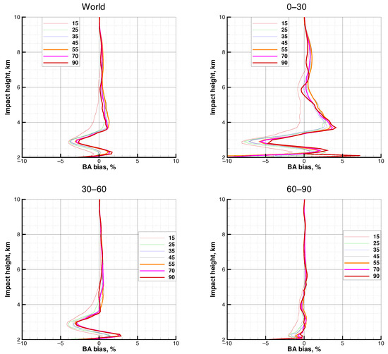 Statistical comparison of bending angles retrieved from RO observations with GFS analyses for different missions and for each mission’s median normalized SNR from Table 1. Systematic difference, dynamic normalization. Upper left: world, upper right: tropics, lower left: middle latitudes, lower right: polar latitudes. All the latitude bins cover both North and South hemispheres.