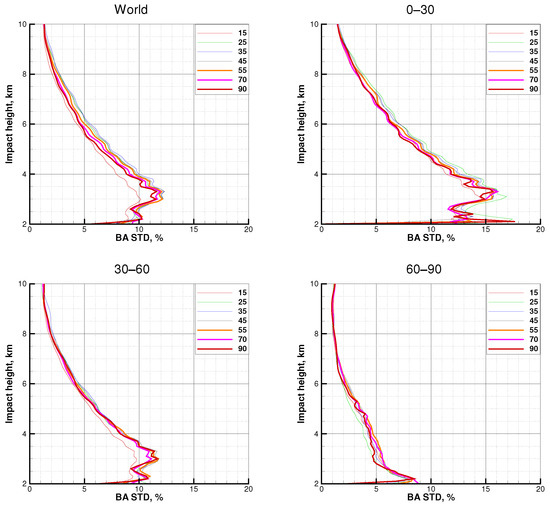 The bending angle STDs appear to be close to each other for all missions despite quite strong differences in the normalized SNR (Table 1) and even stronger differences between the nominal SNRs [32]. We can conclude that higher SNR values do not necessarily result in a proportionally higher statistical quality of the RO profiles, if the SNR is above a certain threshold. On the other hand, the high-SNR RO data are believed to be valuable for scientific studies of super-refraction and the boundary layer.