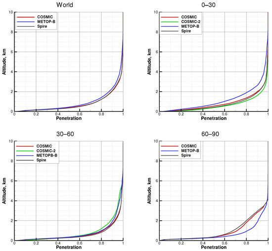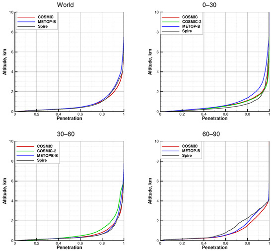 A study of the dependence of the COSMIC-2 inversion on the non-normalized SNR was performed by Ho et al. [19]. The occultations are divided into five groups: 0–500, 500–1000, 1000–1500, 1500–2000, and >2000 V/V. For these groups, the penetration in the tropics defined the occultation number fraction of 0.8, changing from 1.2–1.3 to 0.3–0.4 km. This is in qualitative agreement with our results indicating a steady improvement of the penetration with increasing SNR. It is difficult, however, to compare these results quantitatively, because they depend on the cut-off criteria, which involve a trade-off between a better penetration and worse STD. However, for METOP-B, the average penetration, without the evaluation of its dependence on SNR, is much worse: 3.3–4.4 km. In our study, the difference in the penetration between METOP-B and COSMIC is not that drastic. In the tropics, the METOP-B penetration is 1.2–1.9 km versus 0.5–1.7 km for COSMIC-2. In Schreiner et al. [18], we can also see a significant scatter of penetration depth estimates for different missions.