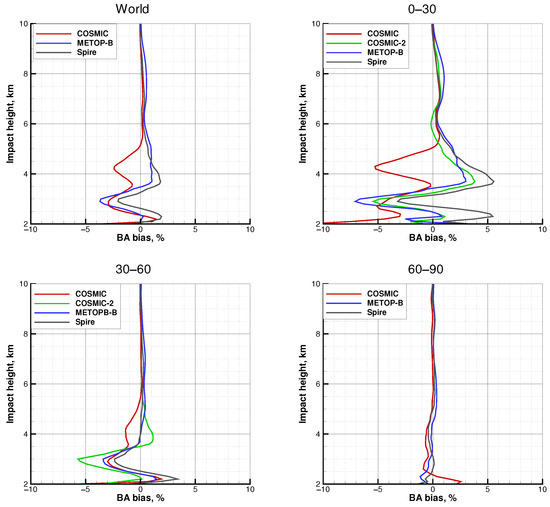 The bias in RO observation is difficult to understand because it has multiple components with different signs caused by different mechanisms [13,46,47,48]. Here, the bias patterns are similar for COSMIC-2, METOP-B, and Spire. The bias pattern for COSMIC differs significantly. Presumably, this is because these older data had to be evaluated with respect to GFS reference data from the year 2008, which had a lower resolution, height range, and accuracy as compared to GFS data for the years 2020 and 2021. The tropical bias of Spire below 3 km is shifted toward more positive values compared with other missions.