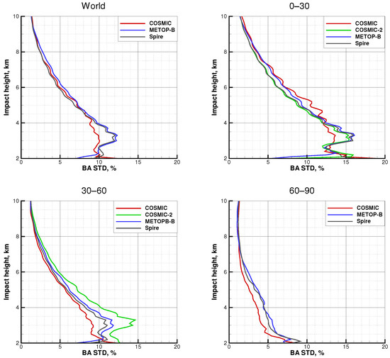 In the comparison of the STD, it must be taken into account that COSMIC-2 has a special distribution of occultation locations, covering mostly the tropics and partly middle latitudes. Therefore, the STD should be compared in the tropics. Here, COSMIC-2 is close to METOP-B. For the impact height range 4–7 km and below 2.8 km, Spire is slightly better than the other missions. Between 2.8 and 4 km, COSMIC indicates the lowest STD. For the middle and polar latitudes, where COSMIC-2 should be excluded from the comparison, COSMIC indicates the best results. However, for the comparison over the globe, COSMIC indicates the lowest STD for the height range 2.5–4.2 km, and otherwise, COSMIC, METOP-B, and Spire are very close to each other.