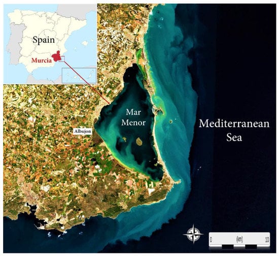 This is the case of Mar Menor, the largest hypersaline lagoon in the Western Mediterranean Sea (Figure 1) and one of the most iconic and emblematic natural areas in Spain due to its significance in terms of habitats and species, its ecological value, and the uniqueness of its ecosystem. Mar Menor, its surrounding wetlands, and natural areas, are of vital natural importance and a protected landscape as a Wildlife Protection Area, Natura 2000 network, Wetland of International Importance (RAMSAR Convention), and a Regional Park. Moreover, the area is a key component of the regional economy, development, and policy plans due to the variety of uses and human activities developed there. The lagoon, with a maximum depth of 6.5 m and a surface area of 135 km2, presents a long sand bar called “La Manga” acting as a barrier between the Mediterranean Sea and the lagoon, only connected through five shallow inlets called “golas” []. The lagoon is close to the Campo de Cartagena region, one of the most intensive agricultural areas in Europe. Several ephemeral wadis drain into the western part of the lagoon, transporting nutrient-enriched waters from agricultural runoff after rainy periods, the Albujon watercourse (Figure 1) being the main collector of the Campo de Cartagena drainage basin and the only permanent wadi flowing into the lagoon [,,,,,]. Therefore, most of the discharges are located in the southern half of the lagoon where the Albujon watercourse maintains a regular flux of water, albeit depending on the torrential and sporadic rainfall regime, as occurred in September 2019 during one of the most extreme storms, known as the “Cold Drop” [].