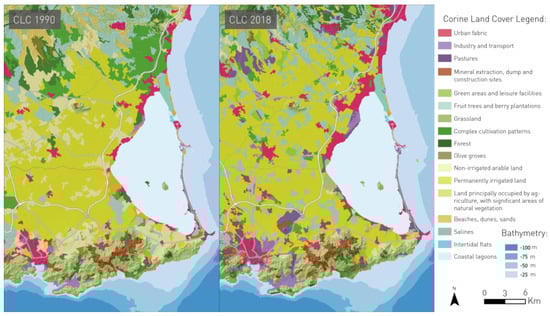 Land cover classification for the Mar Menor lagoon and its surroundings according to Corine Land Cover datasets (https://centrodedescargas.cnig.es/CentroDescargas/; accessed on 1 January 2022) for 1990 and 2018.