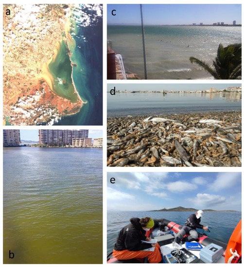 (a) Sentinel-2 scene in Mar Menor after the extreme weather event known as the “Cold Drop” and the catastrophic flooding on 13 September 2019; (b) surface of the water in the lagoon in July 2016 during the environmental crisis; (c) typical resuspension of sediments and increased turbidity during strong winds; (d) latest environmental catastrophe with massive dead fish and crustacean in August 2021 (authorship: Greenpeace); and (e) field campaign carried out in the lagoon in March 2021.