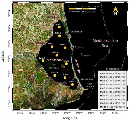 - Erena, M.; Domínguez, J.A.; Aguado-Giménez, F.; Soria, J.; García-Galiano, S. Monitoring Coastal Lagoon Water Quality through Remote Sensing: The Mar Menor as a Case Study. Water 2019, 11, 1468. [Google Scholar] [CrossRef] [Green Version]