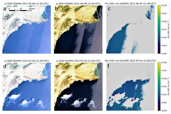 RGB (Red–Green–Blue) composite image on 9 June 2021 from the Sentinel-2 satellite (10 m spatial resolution) at (a) top-of-atmosphere (TOA) level, (b) bottom-of-atmosphere (BOA) level after ACOLITE, and (c) remote sensing reflectance (Rrs, sr−1) of the blue band (492 nm); (d–f) the same on 4 July 2021. Severe sunglint contamination can be clearly observed in the eastern section of the Sentinel-2 tile affecting Mar Menor.