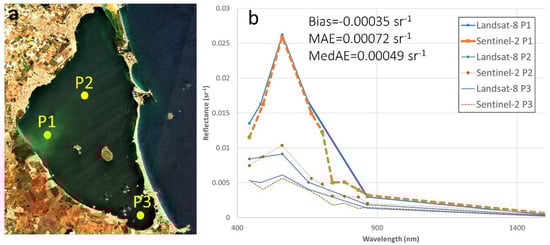 On 3 August 2021, Landsat-8 and Sentinel-2 acquired a scene at 10:45 am and 11:00 am GMT, respectively. Figure 7 shows the spectral signal of both satellites with only a 15 min time difference over three control points distributed across different areas of the lagoon. This exhibits the consistent performance of ACOLITE for both satellite missions, retrieving the spectrum with similar Rrs values for each point and sensor (P1, turbidity of 18.11 and 17.28 FNU; P2, turbidity of 5.5 and 6.1 FNU; and P3, turbidity of 4.08 and 3.93 FNU for Sentinel-2 and Landsat-8, respectively), thus further corroborating the remarkable value of the combined products. Comparison of Sentinel-2 and Landsat-8 Rrs over the visible and NIR bands yielded a bias of −0.00035 sr−1, MAE of 0.00072 sr−1, and MedAE of 0.00049 sr−1. Consistent sunglint and atmospheric correction models are needed to empower the application community to explore these products in order to thoroughly address the ecological conditions of Mar Menor using remote sensing technologies. Recent research already demonstrated the potential of ACOLITE to provide robust information for aquatic and marine applications [,,,]. A study applied Sentinel-2 data to monitor water quality in Mar Menor using the Sen2Cor atmospheric correction processor (designated for land application with restricted performance in water application) and to generate products at 60 m spatial resolution []. However, Pahlevan et al. (2019, 2021) suggested that enhanced information for inland and coastal water quality mapping is required as a critical and urgent task to evaluate spatial and spectral differences under several atmospheric and aquatic conditions [,]. This data record is crucial to ensuring a detailed monitoring of the Mar Menor coastal lagoon with both satellite platforms working in tandem.