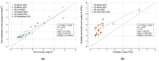 Validation of water quality parameters obtained with Sentinel-2 (S2) and Landsat-8 (L8) during the four in situ campaigns carried out in March, July, August, and November 2021 for (a) chlorophyll-a concentration (chl-a, mg/m3) and (b) turbidity (FNU).