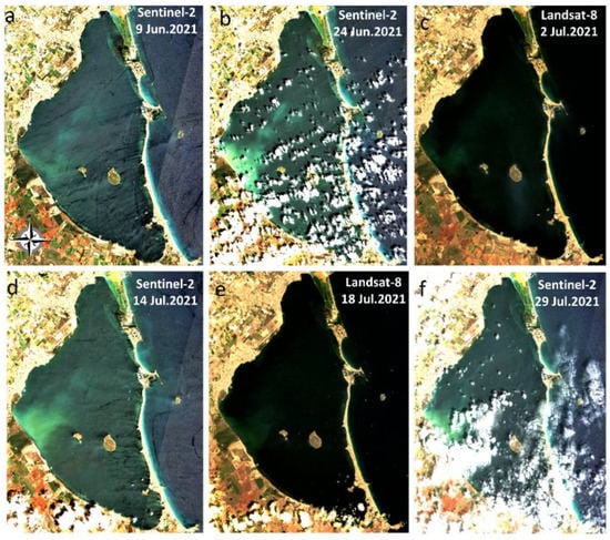 Sentinel-2 and Landsat-8 RGB (Red–Green–Blue) composite image acquired on (a) 9 June 2021, (b) 24 June 2021, (c) 2 July 2021, (d) 14 July 2021, (e) 18 July 2021, and (f) 29 July 2021.