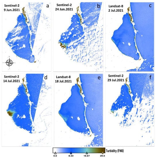 Turbidity (FNU) from Sentinel-2 and Landsat-8 acquired on (a) 9 June 2021, (b) 24 June 2021, (c) 2 July 2021, (d) 14 July 2021, (e) 18 July 2021, and (f) 29 July 2021.