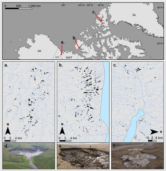 - Lewkowicz, A.G.; Way, R.G. Extremes of Summer Climate Trigger Thousands of Thermokarst Landslides in a High Arctic Environment. Nat. Commun. 2019, 10, 1329. [Google Scholar] [CrossRef] [PubMed] [Green Version]