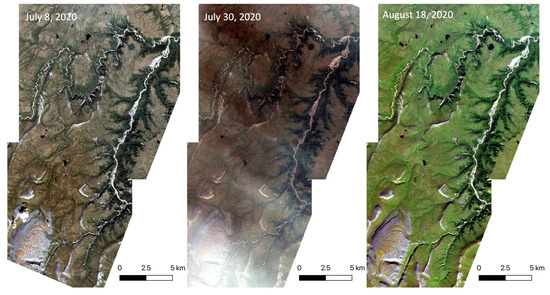 We downloaded PlanetScope images from Planet Labs (www.planet.com, accessed on 14 December 2020) via their Education and Research Program and chose the “Analytic_SR” product, which has been orthorectified and converted to surface reflectance. PlanetScope is a constellation of more than 100 CubeSats, which acquires daily images at a spatial resolution of approximately three meters. The 16-bit images contain four bands providing measurements in red, green, blue, and near-infrared wavelengths. All images for this study were acquired in July and August of 2020 (Table 1). We obtained mosaic and daily PlanetScope images, and used them for different purposes. The mosaic images provided complete coverage for each study area and served as base maps for manually delineating thaw slump boundaries (i.e., ground truth). Daily PlanetScope images acquired on a specific date were used for testing the performance of the deep learning model under different image acquisition conditions (Figure 2). To utilize all four bands in DeepLabv3+, we converted each 4-band image to two 3-band images (RGB and nirGB) with a bit depth of 8 bits. RGB images combined red, green, and blue bands, while nirGB images included near-infrared, green, and blue bands. We also applied data augmentation to increase the size and diversity of training data. Specifically we used eight options: flip, blur, crop, scale, rotate, bright, contrast, and noise. We performed experiments to determine which combination of these options resulted in the highest mapping accuracy.