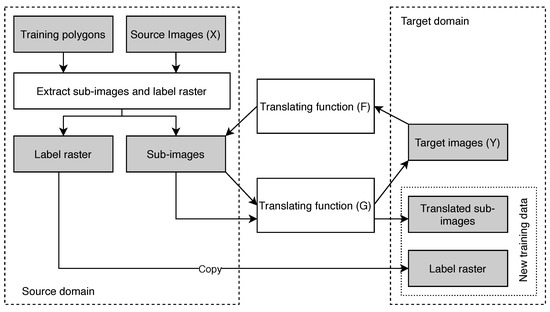 We chose images in the source and target domains and used CycleGAN to translate them from one domain to another, as shown in Figure 4. CycleGAN is a state-of-the-art GAN framework that can successfully translate images from one domain to another [61]. CycleGAN has two translating functions G: X->Y and F: Y->X (Figure 4) and uses two discriminators (not shown) to encourage G to produce G(X) images indistinguishable from domain Y and F(Y) images indistinguishable from domain X, respectively. To create source and target images, we extracted sub-images and the corresponding label raster, then used the sub-images and target images as training data for CycleGAN. We adopted the code published by the CycleGAN’s authors and modified them for remote sensing data to emulate projection and tiling (github.com/yghlc/contrastive-unpaired-translation, accessed on 25 October 2021). We followed standard training protocol to train the CycleGAN up to 200 epochs as suggested by [61]. During training, we also monitored the output of CycleGAN and ensured that generated images appeared reasonable in the later stage of training. We used the well-trained translating function G to convert the sub-images into domain Y, then copied the corresponding label rasters, which created new training data that have the same distribution of domain Y and would be used to train DeepLabv3+.