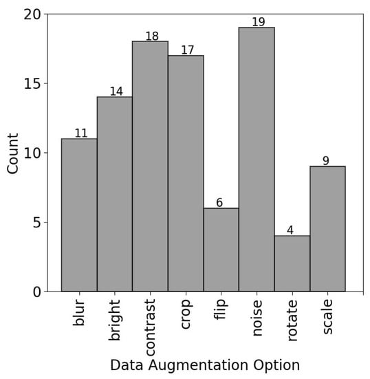 Frequency of each data augmentation option used in trained models reaching maximum pIOU in test datasets acquired on different dates (the last column in Table 4).