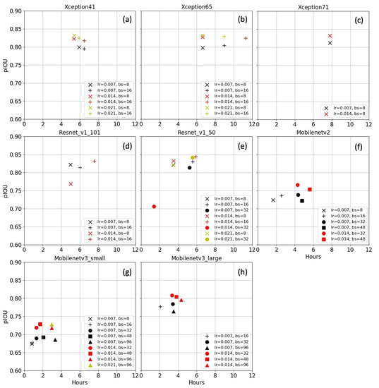 The accuracy, training time, and prediction time required when using different hyper-parameters were 0.675–0.844, 0.84–11.32 h, and 0.52–9.79 h, respectively (Figure 7 and Table 5). In total, 160 experiments using different combinations of backbones, learning rates, and batch size were performed but only 47 of these were successful because: (1) some experiments with inappropriate learning rates ended in divergent training loss and (2) some combinations were limited by GPU memory (32 GB, Tesla P100 × 2). The pIOU calculated using the validation dataset of these 47 experiments varied from 0.675 to 0.844, and training time required ranged from 0.84 and 11.32 h. The processing time required to make predictions across the three study areas ranged from 0.52 to 9.79 h (Table 5). Experiments with Xception achieved pIOU between 0.798 and 0.832, and but the larger depth of this network required more GPU memory (i.e., smaller batch size) and more training time (Figure 7a–c). A larger learning rate resulted in higher pIOU if the training was not divergent (Figure 7). A larger batch size generally required more training time but this did not guarantee improved pIOU (Figure 7b). Resnet also achieved a high pIOU, comparable to Xception, except for two experiments (Figure 7d,e). Compared with Resnet_v1_101, Resnet_v1_50 allowed larger batch size and achieved higher pIOU. Figure 7f,g show that MobileNet required less training time, but resulted in lower pIOU. MobileNetv3_large could also achieve pIOU that was similar to Xception and Resnet (Figure 7h).