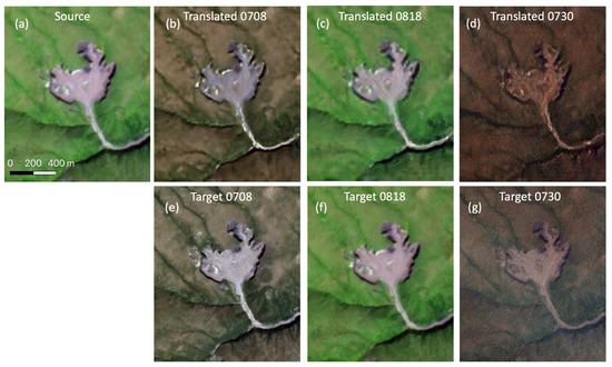 Source and translated images from the WR region: (a) is a sub-image from a source domain (the mosaic image), and (b–d) are translated images by different well-trained CycleGAN models. (e–g) are the corresponding target images. The numbers at the top or each image (e.g., 0708) show the acquisition dates of images in target domains.