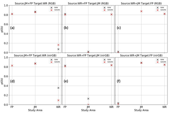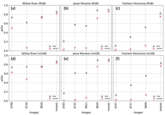 Comparison of the accuracy (pIOU) among experiments with and without GAN domain adaptation for images acquired in different study areas. (a–f) show the accuracies of different experiments. WR: Willow River, JM: Jesse Moraine, FP: Fosheim Peninsula.