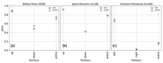 Comparison of the accuracy (pIOU) among experiments with and without GAN domain adaptation for different parts of the images in one region. (a–c) show the accuracies of different experiments.