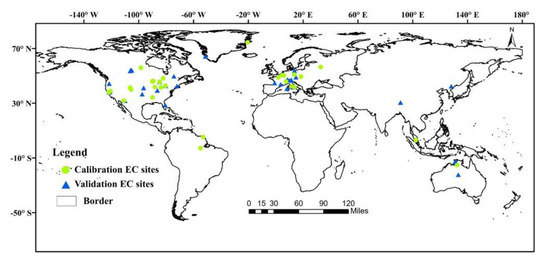 Geographical distribution of the eddy covariance (EC) flux sites used in this study. Green circles stand for sites used for calibration, while blue triangles indicate sites used for validation.