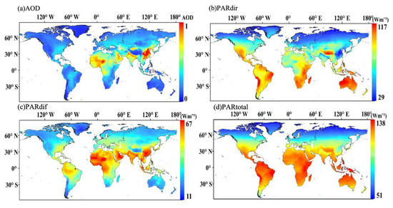 The spatial distribution of annual mean values of (a) AOD, (b) PARdir (W m−2), (c) PARdif (W m−2), and (d) PARtotal (W m−2) from 2000 to 2014 globally.