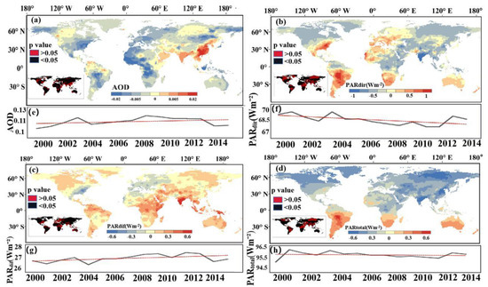 The spatial distribution of the trends in mean of (a) AOD, (b) PARdir (W m−2), (c) PARdif (W m−2), and (d) PARtotal (W m−2) from 2000 to 2014. The map insets in (a–d) show the significance level of the trends of AOD, PARdif, PARdir, and PARtotal, respectively, with the red area indicating significant trends (p-value < 0.05) and the black area indicating insignificant trends. The temporal variation of annual AOD, PARdir, PARdif and PARtotal that were spatially averaged over the globe are illustrated in (e–h), respectively; the red lines are the fitting lines.
