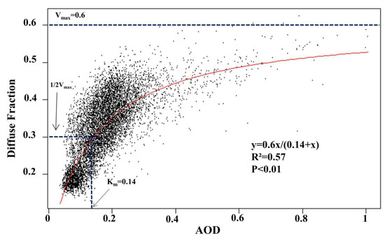 The AOD had a high correlation with the diffusion fraction (Df) (Figure 4; R2 = 0.57, p < 0.01), and the influence of AOD on Df can be expressed by the distribution of the Michaelis–Menten equation (Equation (5): Df = Vmax × AOD/(Km + AOD), where AOD is set to range from 0.1 to 1). Among them, Vmax represents the threshold of Df that could be affected by AOD (Figure 4), that is to say, AOD will not have an impact on Df once Df exceeds this value (0.6). In addition, Km represents the AOD value (0.14) when Df is half Vmax (i.e., 0.3) (Figure 4). According to this equation, we can know the increase velocity of diffusivity under different aerosol loading. When the AOD loading was low (from 0 to 0.14), Df increases rapidly (from 0 to 0.3), which was a first-order reaction. As the value of AOD increases (from 0.14 to 1), the growth rate of Df starts to slow down (from 0.3 to 0.6), which was a second-order reaction. Overall, most of the AOD values were low, indicating a large scatter at low AOD.