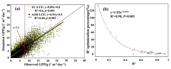 (a) Comparison of GPP (g C m−2 day−1) calculated by EC-LUE model and AOD-LUE model with GPP based on EC flux towers. The dotted red line shows the intersection of the two models. (b) illustrates how the AOD-LUE model compares with the EC-LUE model when the changed percentage value of R2 ((AOD-LUE − EC-LUE)/EC-LUE) × 100) varies with the R2 value of the EC-LUE model.