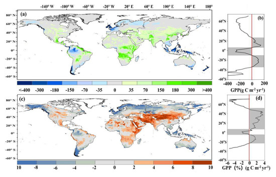 The spatial distribution of aerosol effects on global (a) ΔGPP (g C m−2 yr−1) and the variation of its annual (b) latitude from 2000 to 2019.The percentage changes in the spatial distribution of (c) ΔGPP (%) (GPP(AOD-LUE) − GPP(EC-LUE)/GPP(EC-LUE) × 100) caused by aerosols and the variation of its (d) latitude from 2000 to 2019.