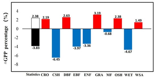 Different terrestrial ecosystems responded differently to aerosols (Figure 7). Among all vegetation types, aerosols had a positive impact of 2.38% on ΔGPP and a negative impact of 3.83%. The GPP increased for some subtropical and temperate vegetation, some drought-tolerant woods and dry grasslands, but decreased for other vegetation types, including tropical vegetation and alpine vegetation (Figure 7). Specifically, there was a negative correlation between ΔGPP and aerosols in Evergreen Broadleaf Forest (EBF) (−6.45%), Evergreen Broadleaf Forest (EBF) (−3.97%), Evergreen Needleleaf Forest (ENF) (−3.36%) and Wetlands (WET) (−4.67%). Aerosol positively influenced ΔGPP in the mainly Grassland (GRA) (3.19%) and Deciduous Broadleaf Forest (DBF) (2.63%), graminoid and Open Shrub (OSH) (2.38%), Crop (CRO) (2.19%) and Woody Savanna (WSA) (1.49%).