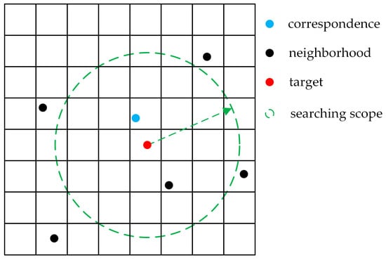 where and are the relative transformations from frame to frame , including rotation and translation, respectively. Superscript refers to the world frame or map frame, and subscript is the timestamp. is the initial estimation of the relative pose of frame and frame , and is the posterior estimation of the relative pose of frame and map frame . After extracting the feature points of each frame of the image, to avoid searching the entire image, KDTree [46] is employed to store the pixel coordinates of the feature points and search for their correspondences. As shown in Figure 3, the green dotted circle indicates the search radius, and the neighbors are those points within the circle. The red point is the initial guess of the map point in the current LiDAR frame. The blue point is the one most similar to the target (by calculating the correlation coefficient with the target). The other black points are the points projected onto the BEV image.