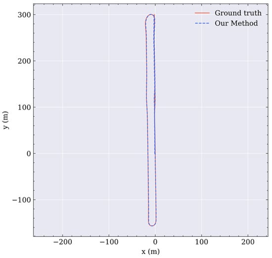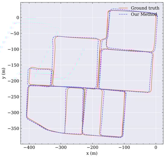 The proposed algorithm outperforms the baseline method in most of the sequences according to the RMSE values, even in some sequences with loops such as Seq. 06. As shown in Figure 4, scale errors of the trajectory appear in the results of the ORB feature-based laser SLAM. Loop closure detection and optimization made little contribution to error reduction. Details can be found in the original literature [49].