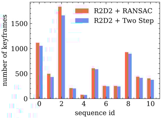 For an in-depth understanding of the issue, the tracking length of the feature points is analyzed using several keyframes. Referring to the keyframe insertion strategy, the fewer the keyframes inserted, the longer the feature points tracked. The contrasting results are presented in Figure 6. As mentioned above, the strategy of keyframe insertion is set as the interval between the current frame and the last keyframe is larger than five or less than 100 inliers tracked. Using two-step pose estimation, fewer keyframes would be inserted in each sequence, indicating that more keypoints would be tracked longer. The total number of keyframes in LiDAR odometry computed by RANSAC and the two-step pose estimation are shown in different colors.