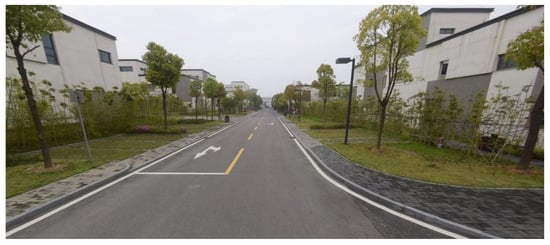 In addition to the KITTI dataset, we tested the generalization of the proposed algorithm on low-resolution LiDAR data. We collected data from the Wuhan Research and Innovation Center, Wuhan City, China, in January 2021. The street view of the park is shown in Figure 7, and the scene is similar to that of the urban environment in the KITTI dataset.