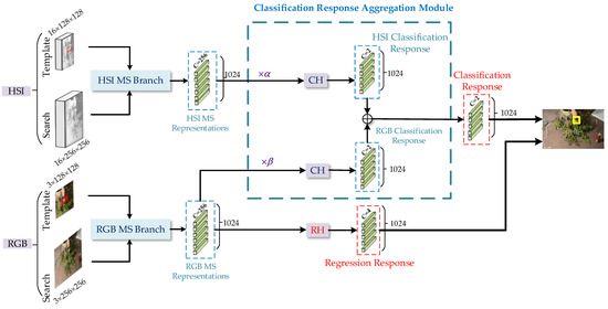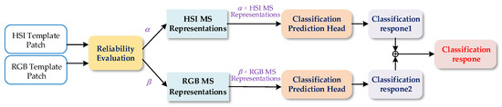 The structure of the classification response aggregation module is shown in Figure 8. To reduce the noise effect caused by low-reliability modality data and to make a more reliable modality play a more important role in the classification task, we use the modality reliability to predict the contribution of different modalities for the classification task and use the contribution value to process the MS representations of the corresponding modality, to maximize the role of the aggregation module in improving tracking performance. We denote the contribution of HSI as , and the contribution of RGB as ( + = 1). Comparing the reliability of hyperspectral and RGB template patches, if the reliability of the hyperspectral template patch is higher than that of RGB, > . On the contrary, if the reliability of the hyperspectral template patch is smaller than that of RGB, < . The processed MS representations of different modalities are input into the classification prediction head, respectively, and the classification response of hyperspectral and RGB can be obtained. The final classification response results from the fusion of different modality classification responses. Denote as the final classification response, as the HSI MS representations, as the RGB MS representations, and as hyperspectral and RGB classification prediction heads, respectively. We utilize the same network for classification prediction, so this study has identical and . The final classification response is defined as: