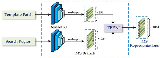 MS branch is the key to effectively obtaining MS representations of different modalities. This branch mainly includes the backbone part for feature extraction and the information transfer part for combining the features of the template patch and the search region. To fully obtain the MS representations, it is necessary to consider the nonlinear interaction between the global information of the template patch and the search region to transfer the modality information fully. TransT proposed in [22] uses the attention module in Transformer to provide a new solution for the nonlinear interaction of global information between the template patch and the search region. Therefore, we construct a dual TransT structure as MS branches to fully obtain MS representations of different modalities. Each branch is designed based on the TransT algorithm, the structure of the MS branch is shown in Figure 3. The ResNet50 presented in [36] is employed as the backbone to extract features, and the features of the template patch and the search region are processed by the Transformer Feature Fusion Network Module (TFFM) to produce the MS representations.