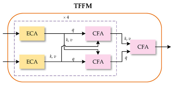 Structure of the Transformer Fusion Feature Module (TFFM). ECA represents the Ego-Context Augment module and CFA represents the Cross-Feature Augment module. As shown in the dotted box, two ECAs and two CFAs form a fusion layer. The fusion layer is repeated four times, and then a CFA is added to fuse the feature maps of the two branches.