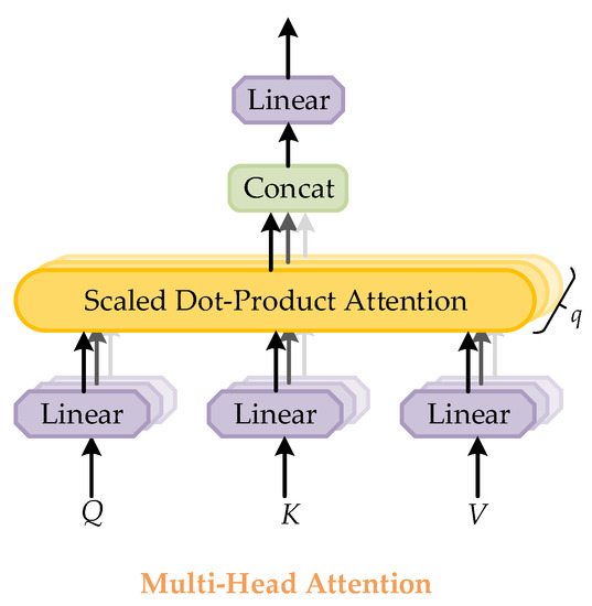 Structure of the multi-head attention module. It consists of several attention layers running in parallel. The symbol q represents the number of attention layers. Each layer takes scaled dot-product attention.