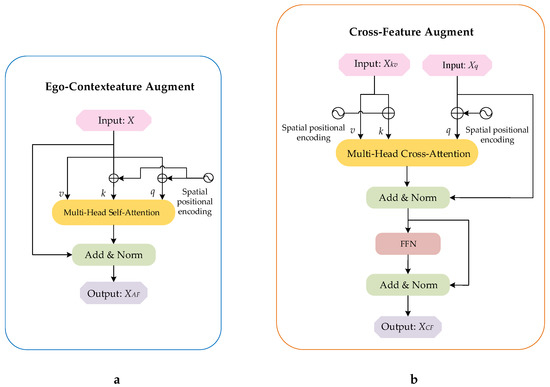 The structure of the Ego-Context Augment module (ECA) is on the left (a), and that of the Cross-Feature Augment module (CFA) is on the right (b). In particular, there is one input in the ECA and two inputs in the CFA.