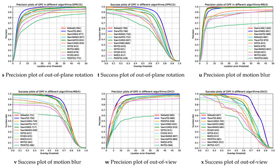 where G indicates the groundtruth box and A is the predicted bounding box. The symbol of represents the number of pixels in the area. Success rate represents the ratio of successful frames to total frames in a series of frames. The success plot shows the success rate trends when the threshold changes from 0 to 1 at an interval of 0.02. The area under the curve (AUC) of each success rate curve is used to rank the success performance of the tracker.