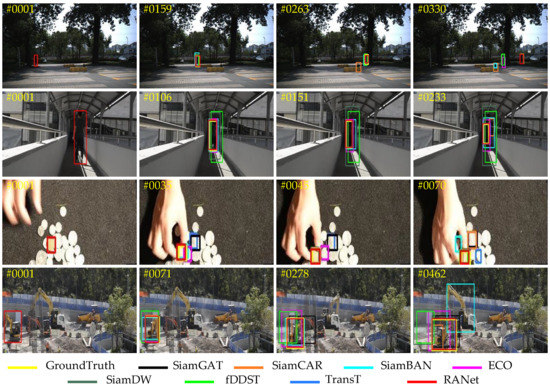 Figure 10 shows the qualitative tracking results of different trackers in some image sequences, which can intuitively compare the tracking performance of the RANet tracker and other trackers.