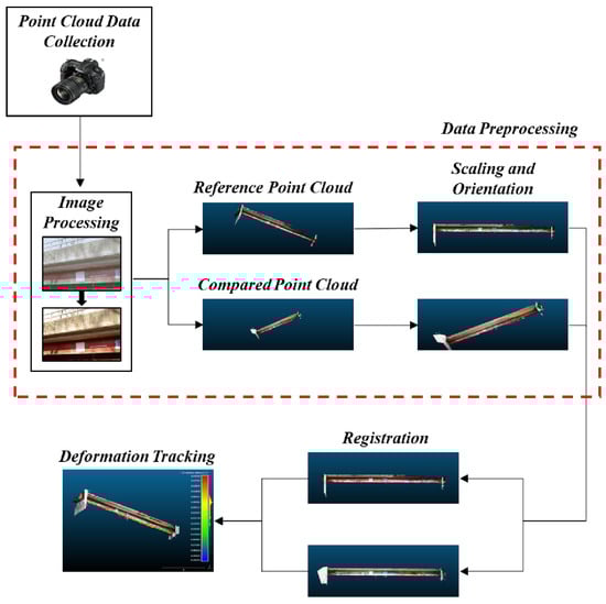 Figure 1 provides an overview of the 3D measurement methodology. In order to quantify deformations, photogrammetric point cloud data are collected from a structure in two states of deformation. The first state is referred to as the “reference” point cloud, representing the unloaded state of the structure, and the second state is referred to as the “compared” point cloud, representing the loaded state of the structure. Prior efforts demonstrated accuracy at the millimeter scale under laboratory conditions for a similar, but simplified, measurement method [36,37,38]. Translating this approach to full-scale field conditions required significant modifications that included specialized image preprocessing, and modifications to the registration algorithm. The overall process is more complex than what is presented in Figure 1, and details are presented in the remainder of this section.