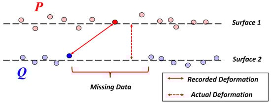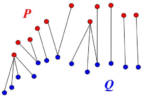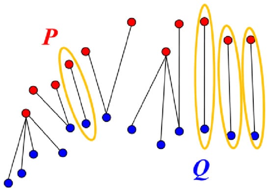 In response to this shortcoming, researchers developed a version of the ICP [55] that adopts characteristics of a generalized Procrustes analysis (GPA). For GPA, point cloud datasets have the same number of points, and the point correspondences are known a priori. The GPA-ICP algorithm mimics this arrangement by only using point correspondences from mutual nearest neighbors before executing the ICP algorithm. A data point is defined as the mutual nearest neighbor to when the nearest neighbor to p in Q is q and the nearest neighbor to q in P is p. Thus, the mutual nearest neighbors have an exclusive nearest neighbor relationship from the remainder of the points in the datasets (Figure 4). Using the mutual nearest neighbors to define the point correspondences for the ICP algorithm results in less sensitivity to outliers at the expense of a higher computational cost.