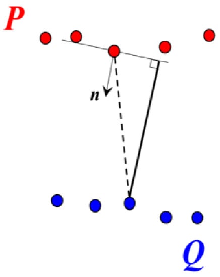 As a result, the cost function includes the surface normal vector, , for the corresponding point, (Equation (3)).