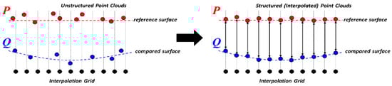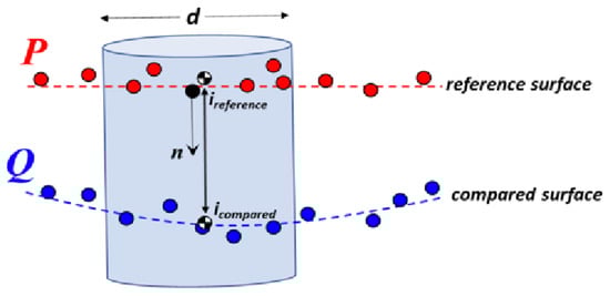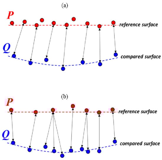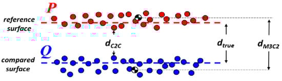 The C2C distance metric is based on a form of the directed Hausdorff distance [60]. In this case, the C2C metric computes the Euclidean distance, d, from a given point in the compared point cloud, Q, to its nearest neighbor in the reference point cloud, P (Equation (4)):