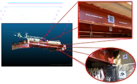 Additionally, four coded targets were placed on each bridge support (eight total targets) and these locations served as the reference points for the alignment of the initial pose of the compared point cloud (Figure 9). It should be pointed out that even though these were coded targets, they were not used in any sort of automatic recognition algorithm from the computer software. Instead, these targets were used because they were easy to identify in the point cloud.