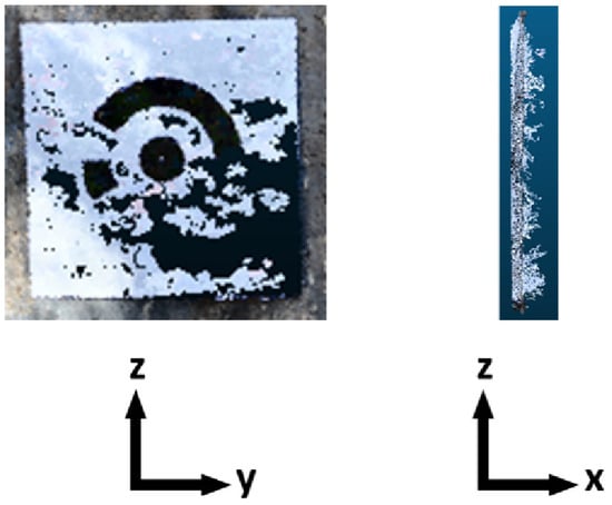 During data collection, a non-coded fiducial target was placed in the scene, along with coded scale bars accurate to 10 m, near midspan of the outer bridge girder (Figure 9). While the coded scale bars were placed in the scene for scaling the point clouds, the non-coded target was designed to create a convenient coordinate axis system such that the direction of primary deformations was collinear with a selected coordinate axis. It is important to note that these targets were not used during the generation process or registration. Rather, they were used to simplify the reporting and interpretation of experimental results.