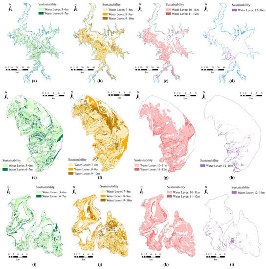 Figure 3. Distributions of the sustainable crane habitats in: (ad) Poyang Lake wetland; (eh) Nanji wetland reserve; and (il) Poyang Lake reserve.