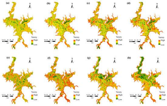 Figure 4. Stabilities of crane habitats within various water level intervals: (a) 5–6 m; (b) 6–7 m; (c) 7–8 m; (d) 8–9 m; (e) 9–10 m; (f) 10–11 m; (g) 11–12 m; (h) 12–16 m.