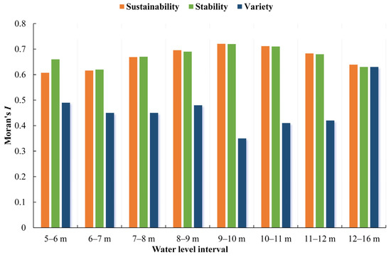 The spatial autocorrelations of the vulnerability distributions were sensitive to water level changes. As the water level increased, the Moran’s I statistics of the variety distribution slightly decreased and then increased, and the value change formed an obvious U-shaped curve (Figure 6). Meanwhile, as the water level increased, the Moran’s I statistics of the sustainability and stability distributions exhibited a consistent tendency of gradually increasing and then decreasing, and their value changes formed two similar inverse U-shaped curves opposite to that of the variety (Figure 6). It is worth noting that the highest values, as well as the lowest value of the variety, simultaneously appeared within the water interval of 9–10 m. Higher or lower water levels had the potential to weaken the spatial clustering characteristics of sustainable crane habitats and their stability. The water level interval of 9–10 m was expected to be an optimal interval for facilitating the aggregation features of crane habitats.