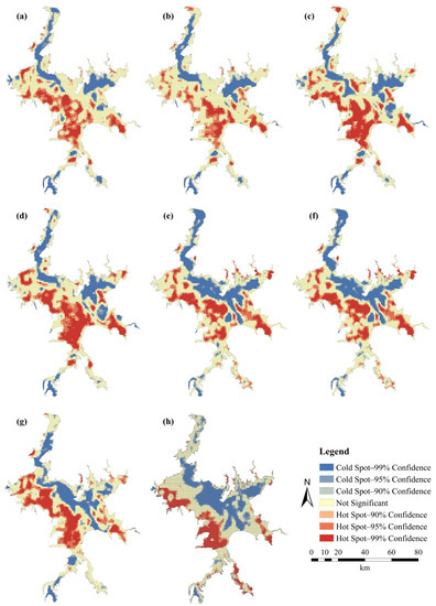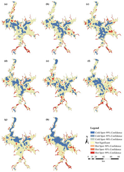 Figure 8. Hot and cold spots of the stabilities of crane habitats within various water level intervals: (a) 5–6 m; (b) 6–7 m; (c) 7–8 m; (d) 8–9 m; (e) 9–10 m; (f) 10–11 m; (g) 11–12 m; (h) 12–16 m.